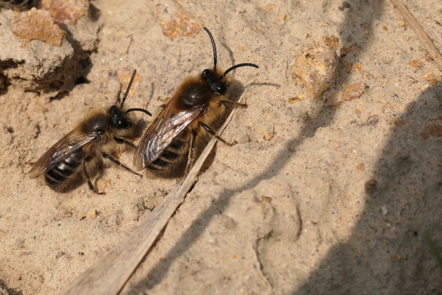 Es handelt sich um die sogenannte Frühlings-Seidenbiene, eine von 21 Seidenbienenarten in Mitteleuropa. Wie der Name schon sagt, fliegt sie bereits sehr früh: Schon im März ist sie draußen unterwegs. Als Nahrungspflanze ist sie spezialisiert auf verschiedene Weidenarten, die zu dieser Zeit schon blühen. Im Gegensatz zu den völkerbildenden Hummeln sind die Seidenbienen sogenannte "Solitärbienen". Sie gründen also kein Volk, sondern sind alleine für das Anlegen der Brutzellen sowie der Nahrungsversorgung ihrer Nachkommen zuständig. Hierfür ist die Frühlings-Seidenbiene auf sandige, offene Böden angewiesen, in die sie fast horizontale Löcher für die Eiablage gräbt. Solche offenen Sandbereiche kann man am Frankfurter Nordpark zum Beispiel in der Nähe des "Grünen Klassenzimmers" finden. Das Vorkommen von Weiden sowie diese offenen Sandbereiche sind also eine Voraussetzung dafür, dass sich diese Bienenart hier im Norden Frankfurts wohlfühlt.