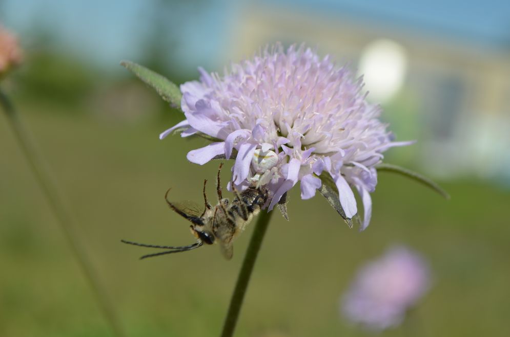 Die Wiesen-Knautie (Knautia arvensis), auch Acker-Witwenblume genannt, spielt auf den Projektflächen im Dessauer Landschaftszug von etwa Mai bis August eine besondere Rolle: Sie ist für die Knautien-Sandbiene (Andrena hattorfiana) die einzige Futterpflanze, die ihr Nektar und Pollen spendet (Die Sandbiene ist allein auf diese Pflanzenart spezialisiert; wenn Bienen von nur einer Art Pollen sammeln, nennt man das "oligolektisch"). Die Wildbiene gräbt, wie zahlreiche andere Wildbienenarten auch, ihre Brutröhre im lückig bewachsenen Erdboden und legt dort Ihre Eier ab. Spätestens wenn die Bienenlarven geschlüpft sind, trägt sie Pollen zur Nahrungsversorgung ein, bis sich die Larven verpuppen und die erwachsenen Bienen ausfliegen. Die Knautien-Sandbiene ist in unserer überdüngten Landschaft, in der bunte Blumenwiesen fehlen, selten geworden und gilt in Sachsen-Anhalt sowie im gesamten Bundesgebiet als gefährdet .